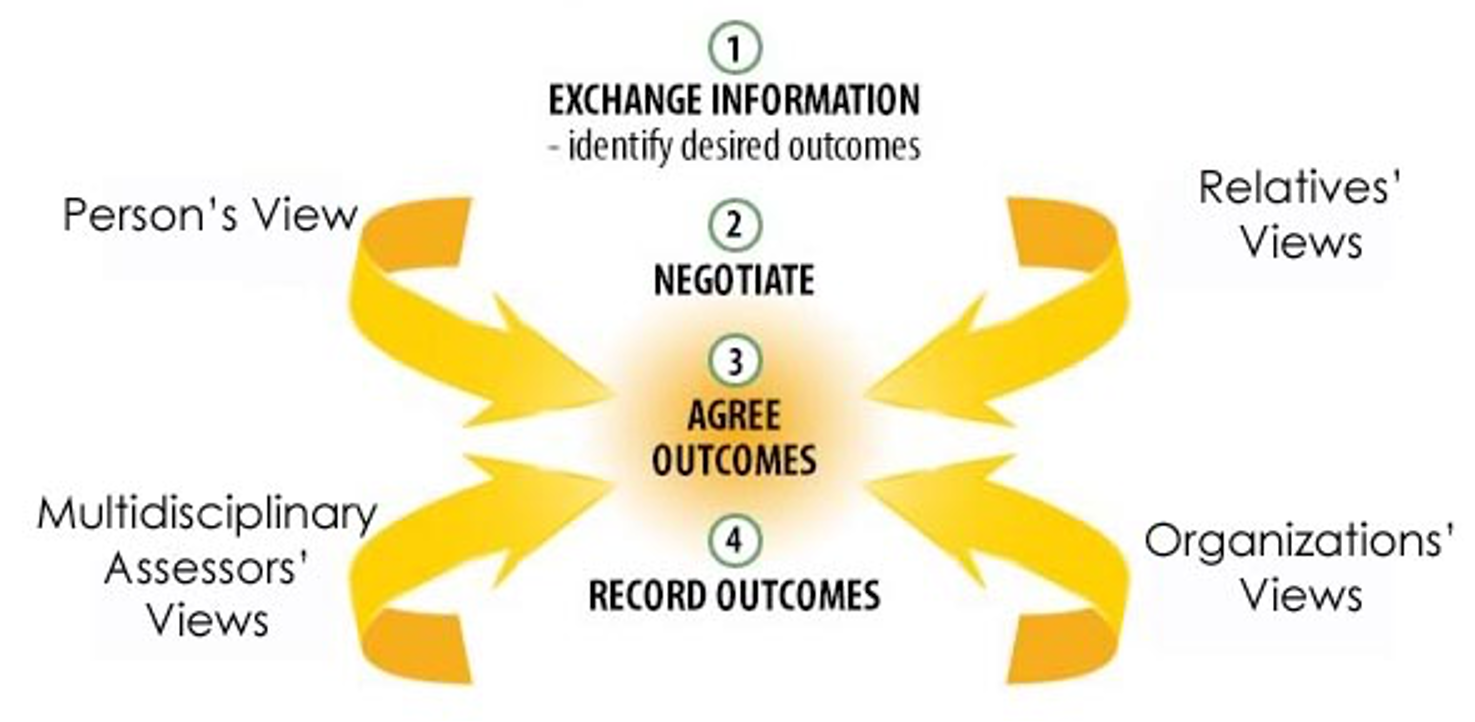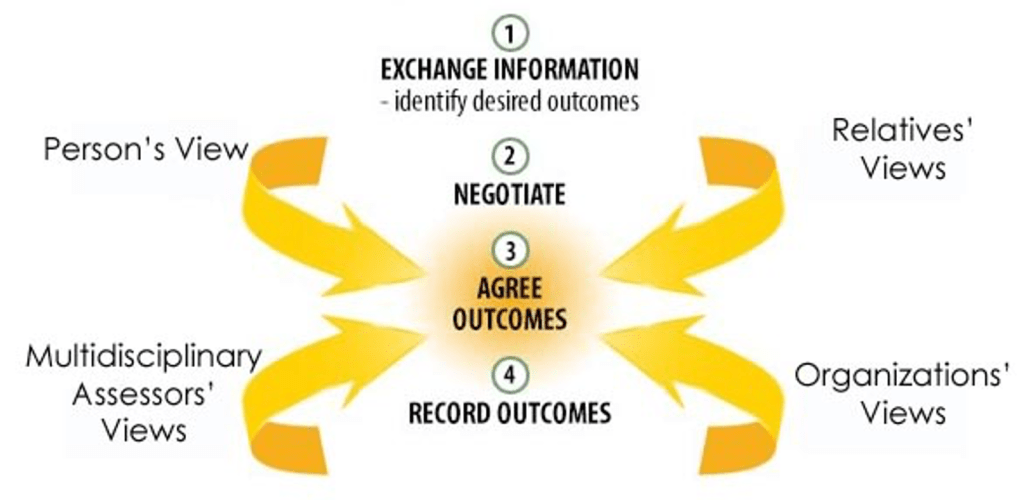 From a practitioner perspective, being outcomes focused can involve a move from ‘fixer’ to ‘facilitator.’ The exchange model of engagement supports the shift from a hierarchical Q and A approach to valuing the person’s perspective as essential, blending it with the views of key others to support effective decision-making. Collaboratively defining outcomes also provides a clear shared purpose.